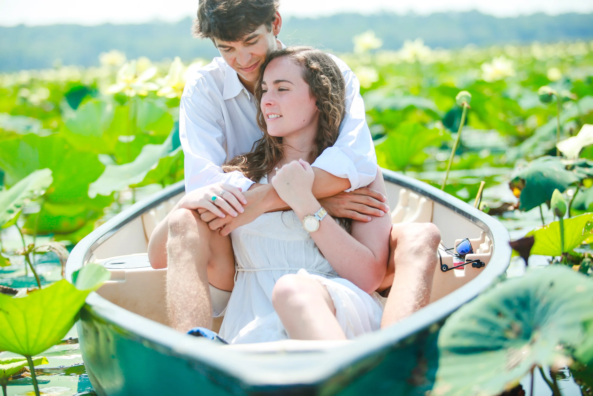 Every once in a while I get clients who allow me to express my vision in whatever way I see fit. Carlen and Andrew met me on an early Tuesday morning and loaded up in two canoes and paddled out to a location off of the Delta River where there were American Lotus flowers in full blossom. I stumbled (well not really) upon these flowers on my rehearsal dinner tour. I asked the cruise director then and there what the possibility was of me doing an engagement session out on the water in the Lotus Flower patch. He assured me it would be no problem, the only thing I needed was a couple. Well, as you can imagine, when I began speaking with Carlen & Andrew’s wedding coordinator and she mentioned they were getting married at 5 Rivers, I knew then and there that this session was meant for them.